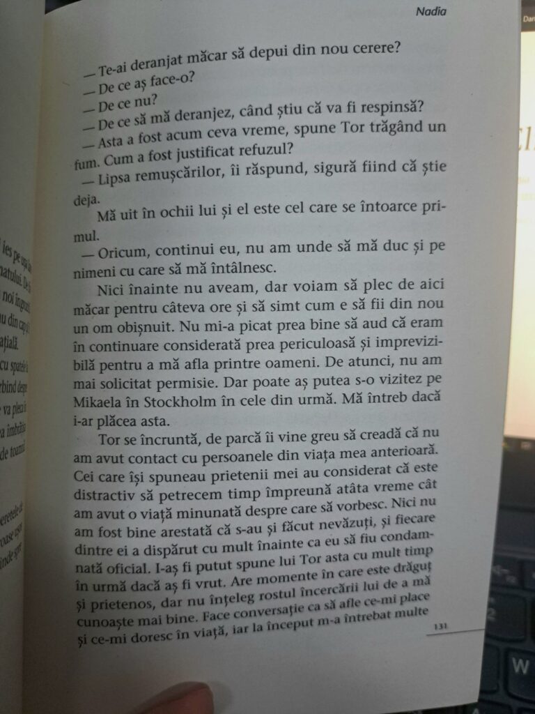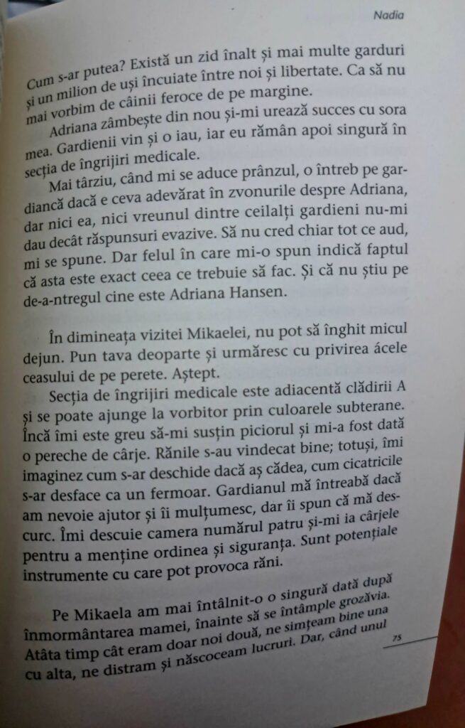 Cine este Nadia, cea care poartă numele romanului și care este explicația din spatele acuzației pentru care Linda a fost încarcerată? O carte care s-a dovedit relativ intuitivă în cea de-a doua parte a sa, dar destul de dinamică încât să îmi mențină atenția. I-aș oferi 3,5 stele din 5, probabil i-aș fi dat 4 pentru maniera în care incursiunile în trecut sunt executate, dar aveam ceva mai multe așteptări de la final și de acolo am scăzut din punctaj.