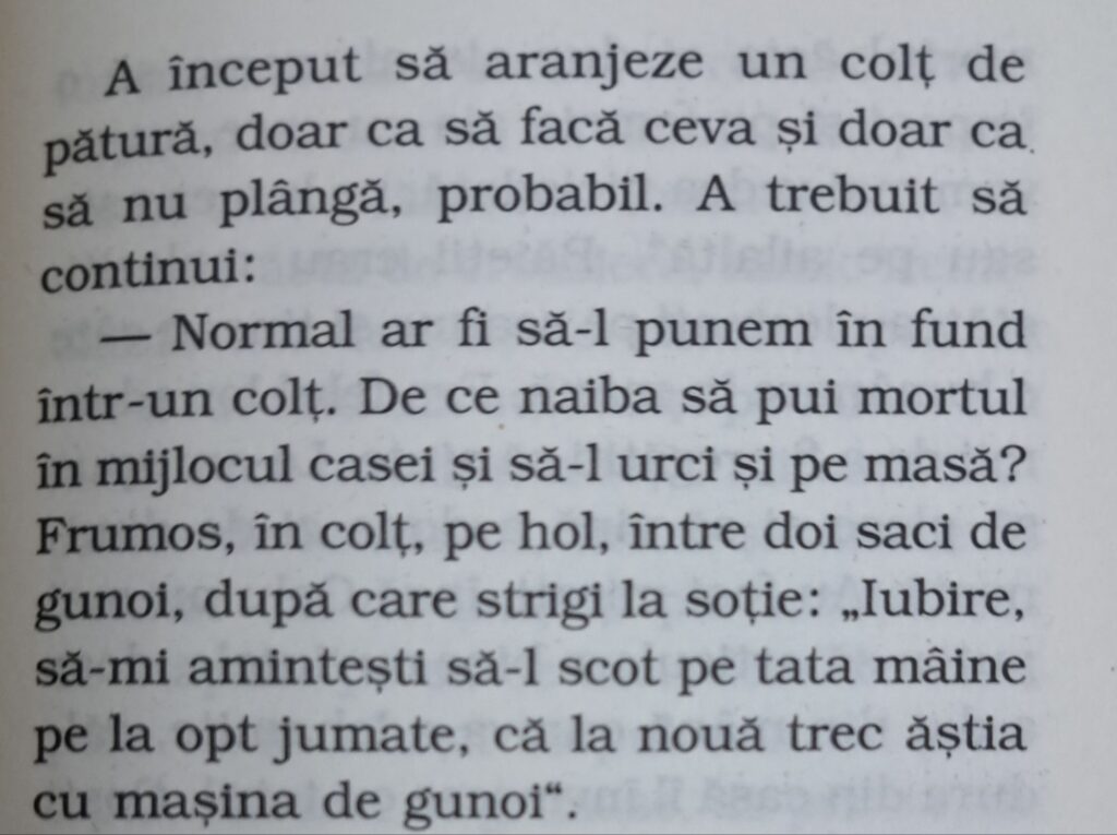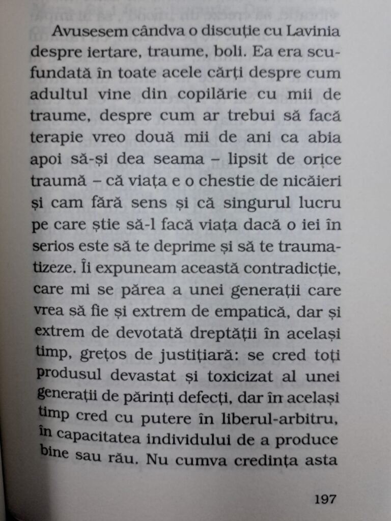 O carte greu de lăsat în mână, plină de cinism și ironia fină a unei vieți trăite din plin, în care nimic nu pare că are finalitate, ci doar este supus unei transformări acide din care, fie alegi să înveți, fie accepți să fii depășit și uitat.